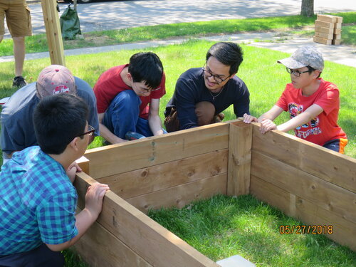 In 2017, local community members joined us in the construction of large wooden planters to house a multitude of vegetables and pollinating flowers. We believe in urban gardening to produce fresh veggies for all to share. Each summer we have expanded our garden and shared raised garden beds with the local community including Kei Lok Yuen seniors group, Fountainwood Apartment residents, local food bank, and church members.